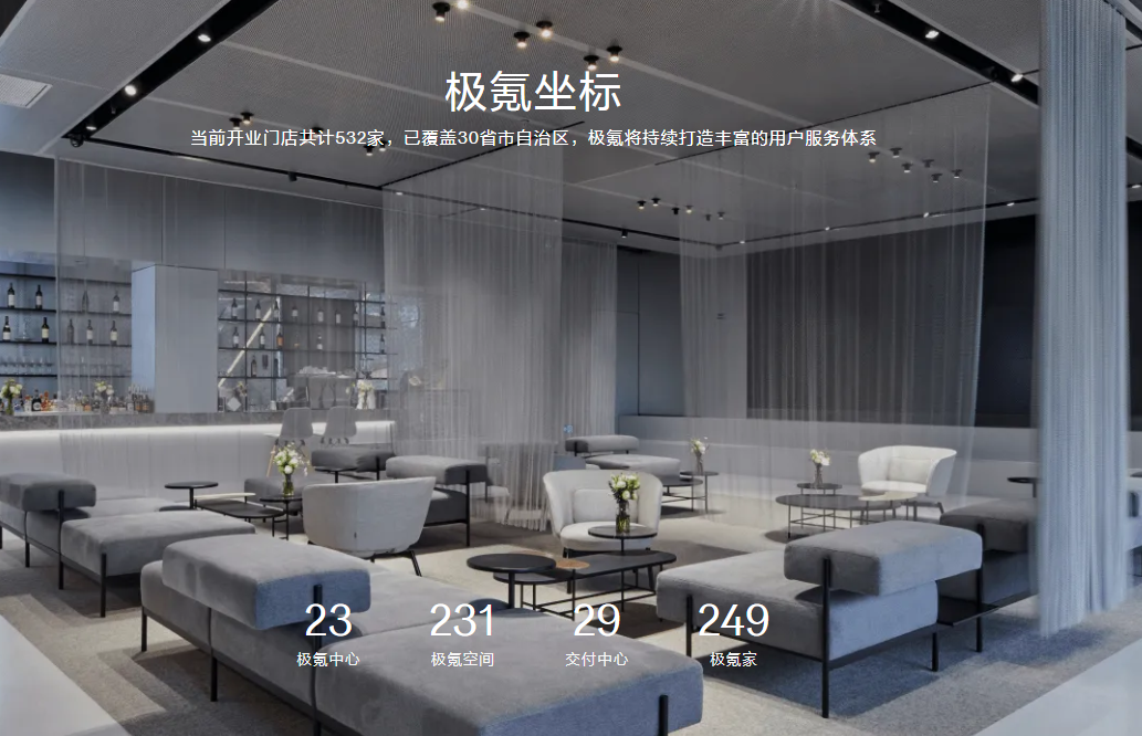 官网显示,截至目前,极氪已在全国范围内建立了532家门店,覆盖30省市及自治区,包含23家极氪中心、231家极氪空间、29家交付中心、249家极氪家。