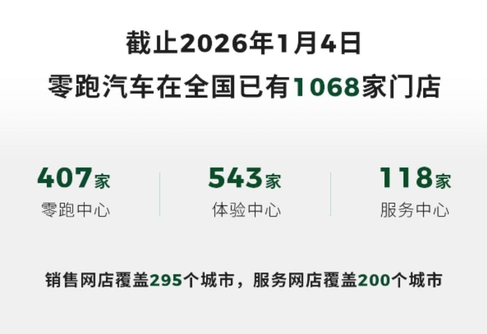 截至2026年1月4日,零跑汽车在全国已有1068家门店,包含543家体验中心、407家零跑中心、118家服务中心,销售网点覆盖295个城市,服务网点覆盖200个城市。
