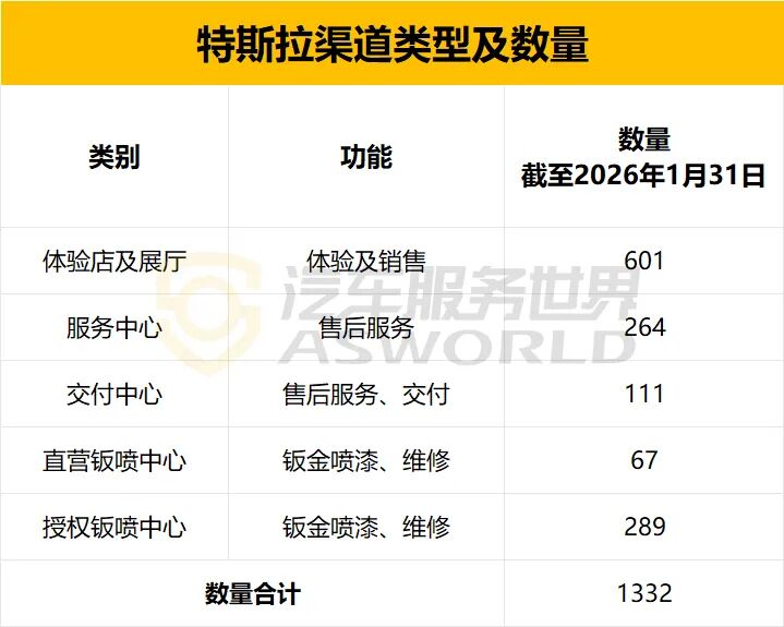截至2026年2月3日,特斯拉全国体验店及展厅共有601家,服务中心有264家,较去年同期增加14家;交付中心111家,较去年同期增加28家;授权钣喷中心增加20家至289家,直营钣喷中心维持在67家的数量。