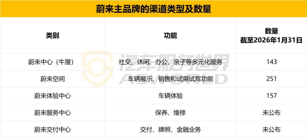 汽车服务世界根据官网统计,截至2026年1月31日,全国门店共计551家(蔚来空间251家、蔚来中心143家、体验中心157家),较2024年第三季度(蔚来中心176家)净减少33家高成本中心店。