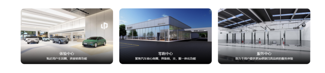 根据不同的功能,零跑展现在消费者面前的门店有如下形式:体验中心(承接销售功能)、零跑中心(销交服一体)、服务中心(售后服务)。