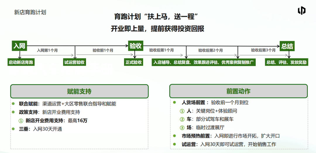 前置动作层面,验收前1个月确保关键岗位、试驾车展车、临时展厅到位,入网即启动市场预热,让新店在试运营阶段就能快速切入市场。