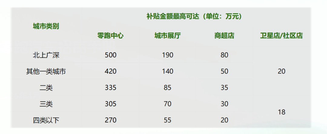 可以看到,北上广深的补贴力度最大,零跑中心单店补贴最高可达500万元,显著高于其他城市,体现了零跑对一线核心市场的战略重视。
