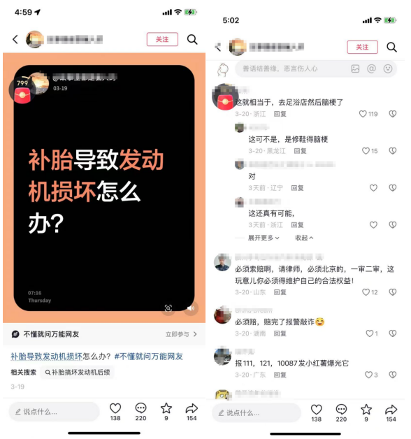 目前社交平台上绝大部分的“引流帖”比较好判断,其发布者大多并非经历者,很多只是为了纯粹的流量,例如“汽修厂补个胎,车主竟然说搞坏发动机”事件发生后,社交平台上就有网友发布了一个“补胎导致发动机损坏怎么办?”的帖子,评论区非常热闹,但发帖者本人并不会下场引导。
