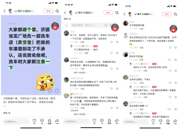 以本月一名河南车主发布的避雷帖为例,其在帖子中写道:“大家都避个雷,济源**广场负一楼洗车店把我的车漆面刮花哭了不承认,还说我讹他呢,洗车时大家都注意一下。”而配图只是将文案做成的一张图,并没有车辆受损的照片,也没有任何能证明“刮花了”的证据。