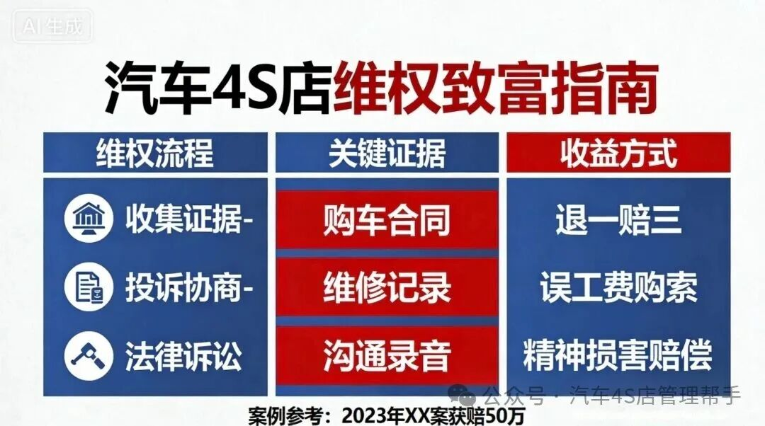 最近,汽车服务世界看到一张很神奇的图,叫“汽车4S店维权致富指南”。