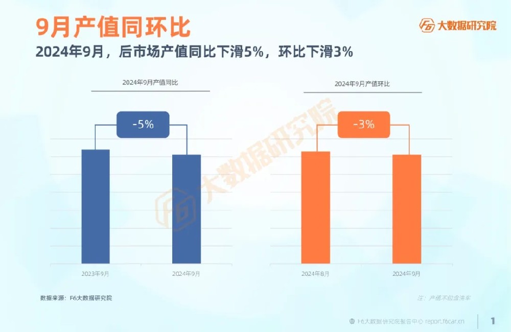2024年9月,后市场产值同比下滑5%,环比下滑3%。2024年9月,后市场进厂台次同比下滑2%,环比下滑3%。